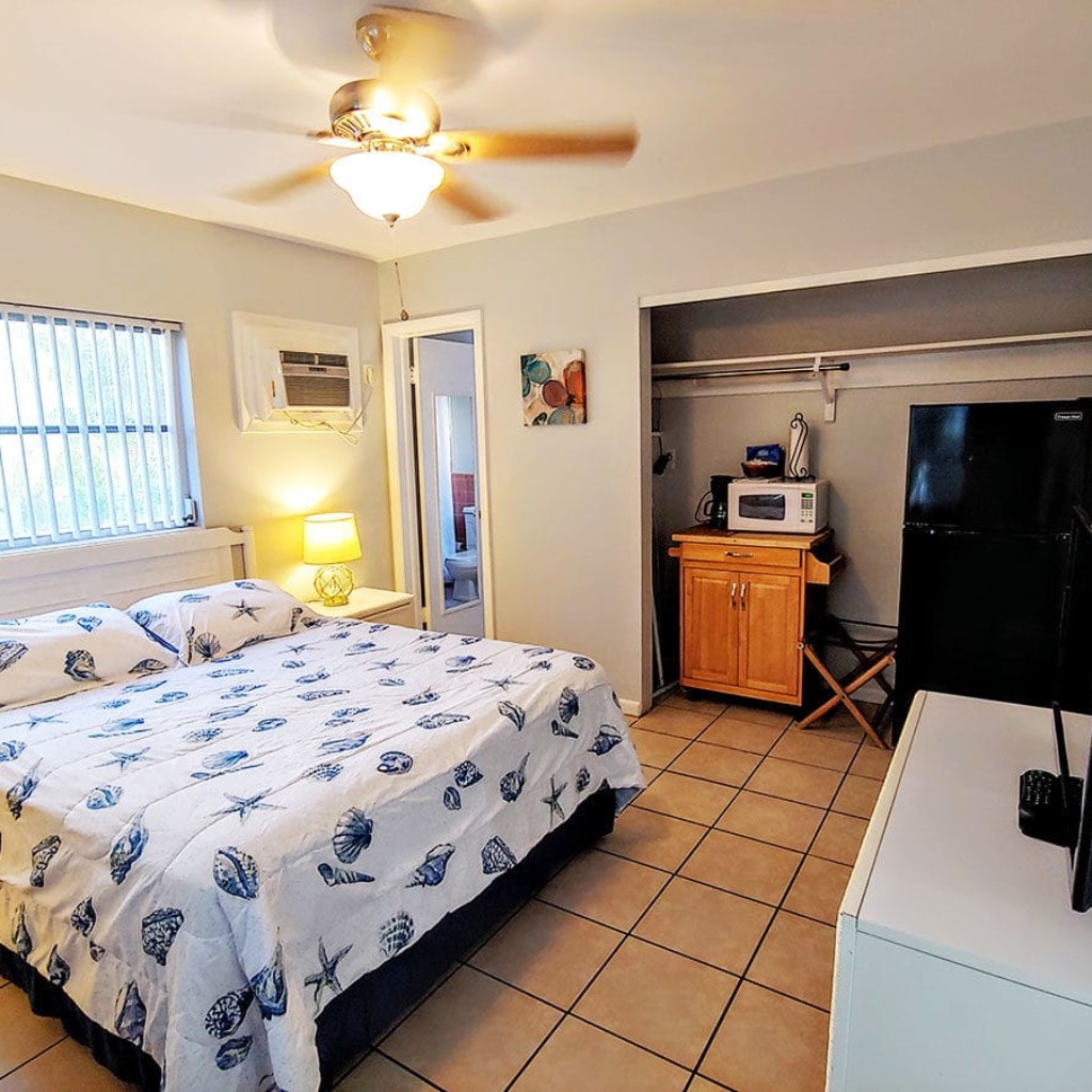Amenities include… remote ceiling fan and TV are provided in each hotel Economy Room which include complimentary cable and wireless internet. Economy Rooms overlook the large heated resort pool. Located just a few steps to the rear is the waterfront deck area with views of boat traffic, jumping fish and dolphins. While you stay with us, enjoy the 2500 sq ft deck which extends out over the water complete with tiki huts, boat slips and guest barbecues. Complimentary fishing rods are available. Wireless Internet is accessible throughout the property.